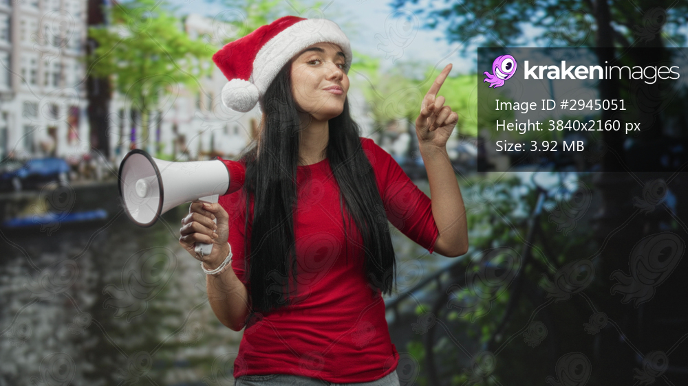 Young woman wearing santa hat holds a megaphone and points finger on a city street by canal buildings, smiling and addressing unseen crowd; holiday cheer. - Kraken Images