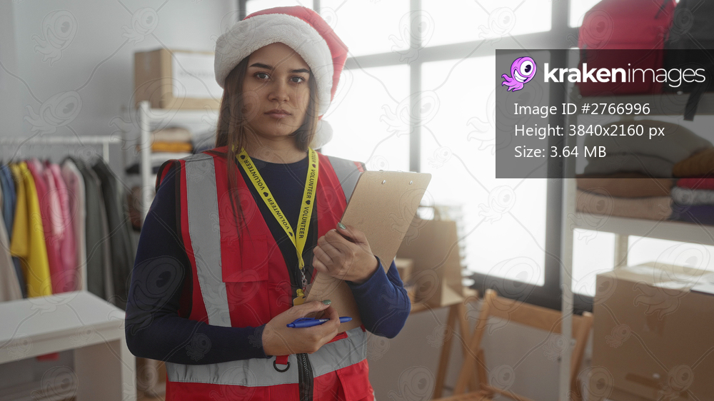 Young woman wearing santa hat holds clipboard in charity donation center surrounded by clothing and boxes volunteering during holiday season indoor setting - Kraken Images