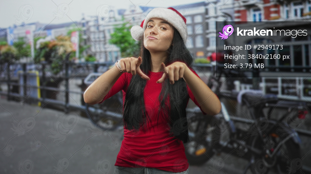 Young woman wearing santa hat points fingers toward camera on a city street by bicycles and canal railings, smiling; holiday cheer playful.