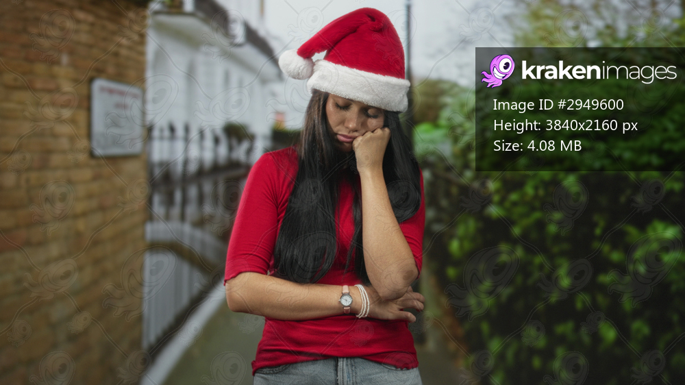 Young woman wearing santa hat resting chin on fist with crossed arms on a residential street, red top and watch visible; loneliness.