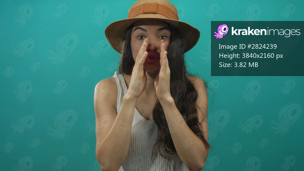 Young woman wearing straw hat and white tank top cups hands to mouth shouting in studio; announcement excitement.