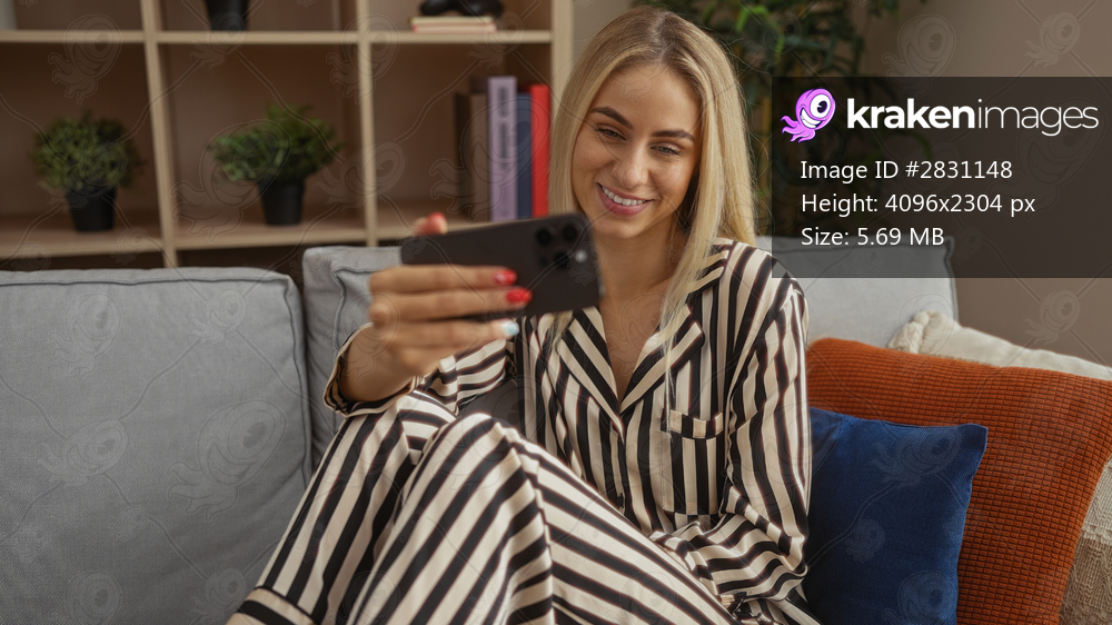 Young woman wearing striped pajamas takes a selfie with her smartphone while smiling on a couch inside a building living room; happiness relaxation leisure comfort. - Kraken Images