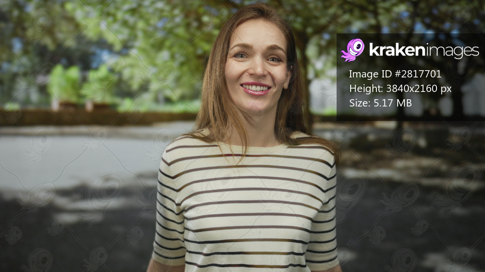 Young woman wearing striped shirt smiling with arms open in green park under bright sunlight; joy.