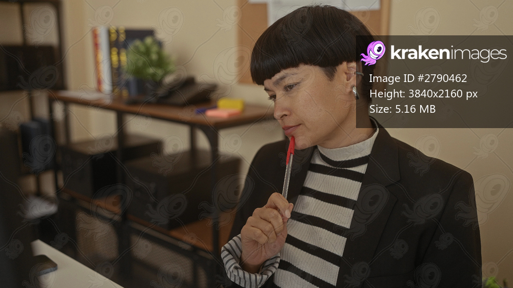 Young woman wearing striped sweater and pondering with pen in an office environment featuring books, plants, and organizational decor.