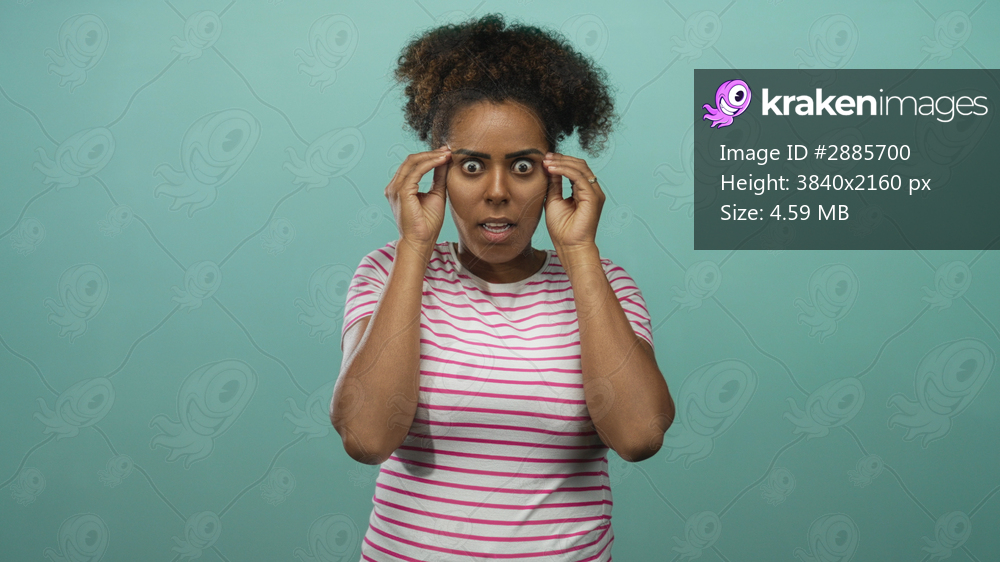 Young woman wearing striped t shirt pulls eyelids wide to show eyes in studio with teal wall; surprise.
