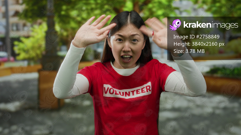 Young woman wearing volunteer shirt with arms raised in park setting with trees and buildings in the background, showing enthusiasm and community spirit outdoors. - Kraken Images