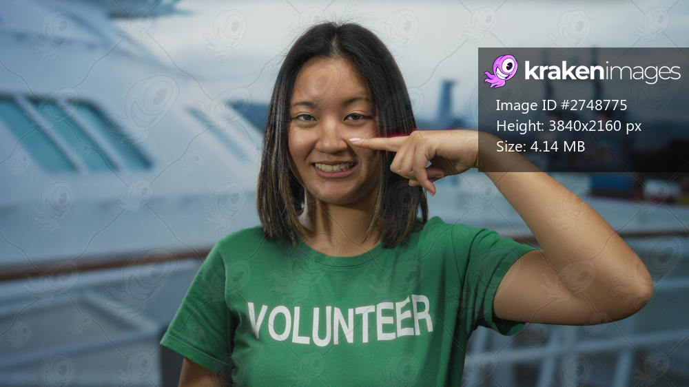 Young woman wearing volunteer t-shirt points to nose on cruise ship with sea in background depicting outdoor seaside scene.