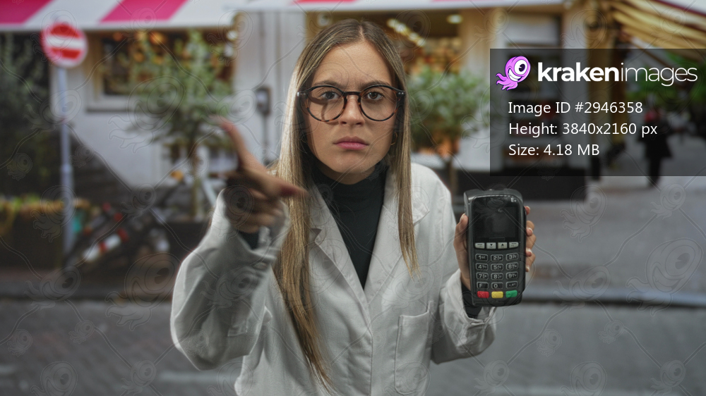 Young woman wearing white coat holding a payment terminal with hand raised in a city street storefront; service refusal disapproval.