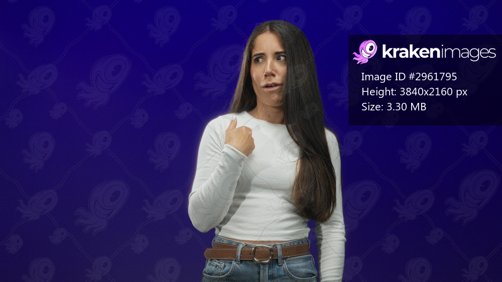 Young woman wearing white long sleeve shirt and jeans displays palms out stop gesture and points thumb to chest in studio; hesitation doubt.