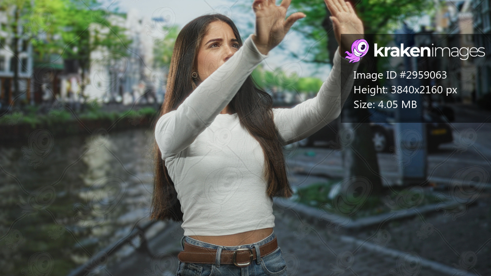 Young woman wearing white long sleeve top and jeans points finger upward with raised hands beside a canal on a cobbled city street; concentration.