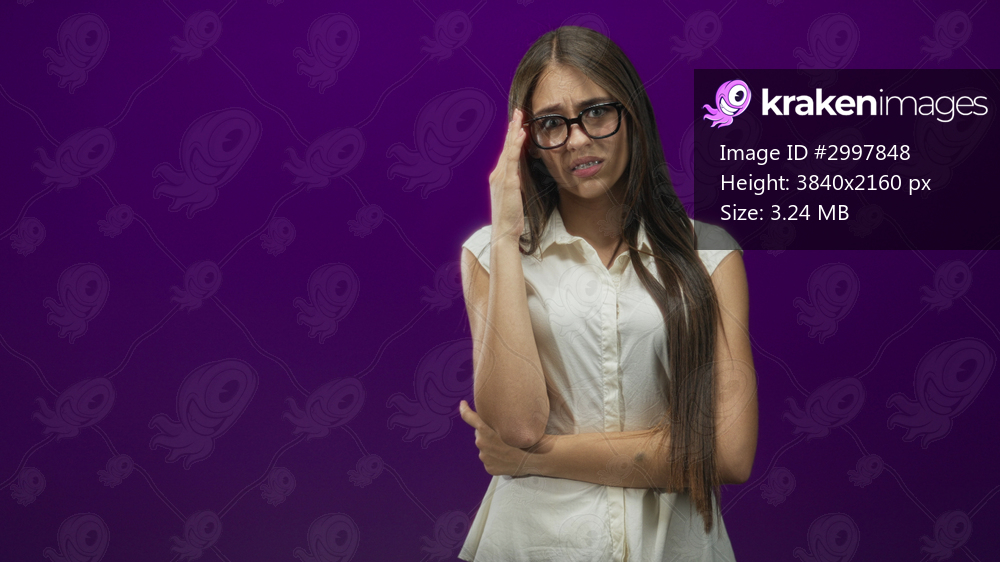 Young woman wearing white shirt and glasses touching her temple with crossed arms in studio; unease.