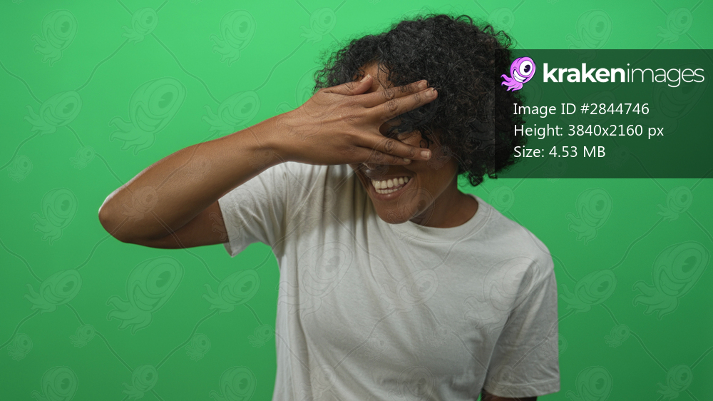 Young woman wearing white t shirt covers eyes with hand while smiling in bright green studio; playfulness.