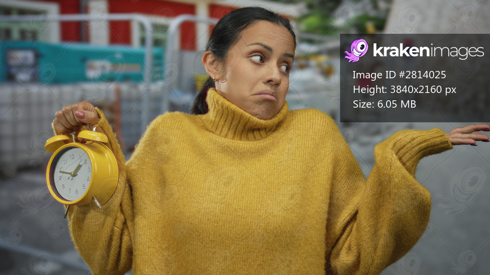 Young woman wearing yellow sweater outdoors holding yellow alarm clock with shrugging expression at a construction site