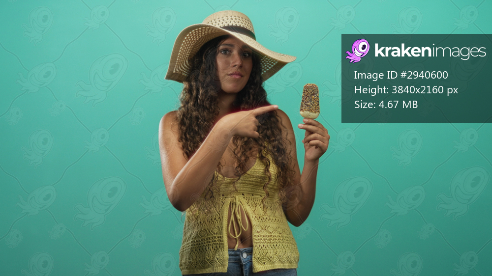 Young woman with wide brim hat and yellow crochet top points finger to chocolate nut popsicle while holding it in studio; summer doubt.