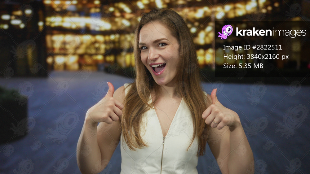 Young woman with wide grin giving double thumbs up gesture in brightly illuminated city street at night; joy.
