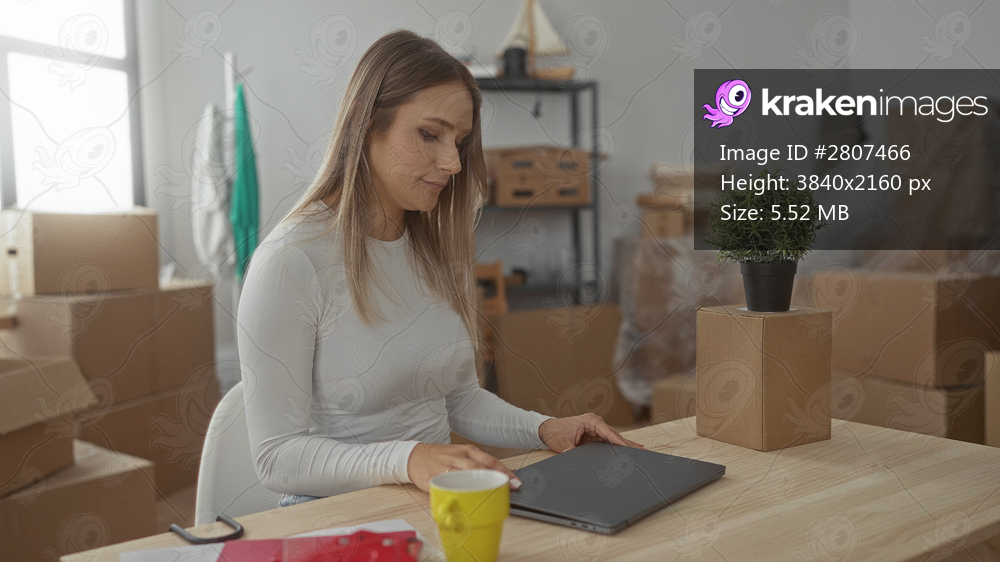 Young woman working on laptop in living room with moving boxes around in her new home indoors, smiling and relaxed.