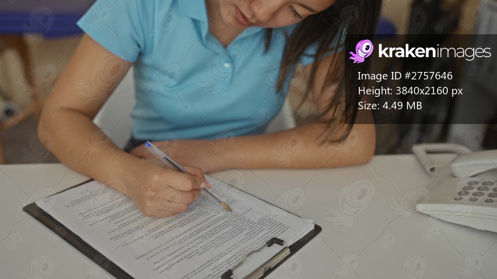 Young woman writing in a clinic workplace, focused on completing forms with a pen in an indoor hospital setting, illustrating a professional environment. - Kraken Images