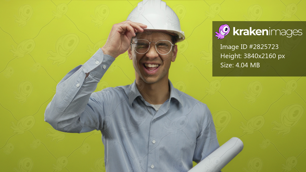 Youthful hispanic man in glasses holding blueprint and tipping hardhat in bright green studio; enthusiasm.