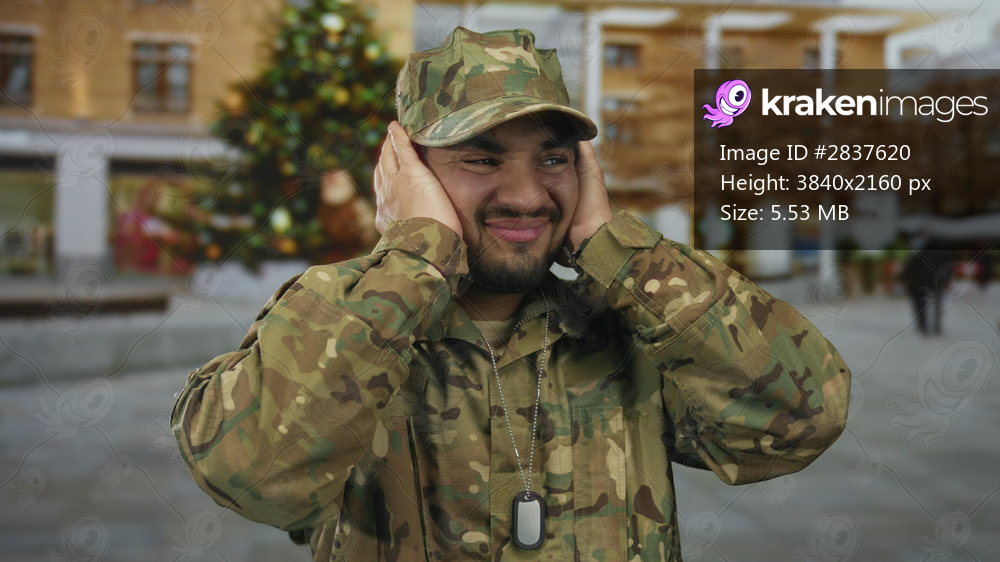 Youthful hispanic soldier in camouflage uniform presses his hands over his ears on urban street; stress.