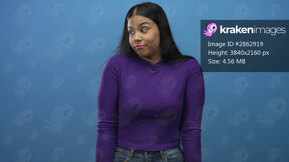 Youthful latin woman in purple top shrugs her shoulders in minimal studio against a vibrant blue wall; uncertainty hesitation.